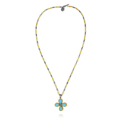 Availability: In StockHandmade Cross with semi-precious turquoise stone with two-tone byzantine style chain from 24 carat double gold filled Silver 925. Made in Greece handmade.